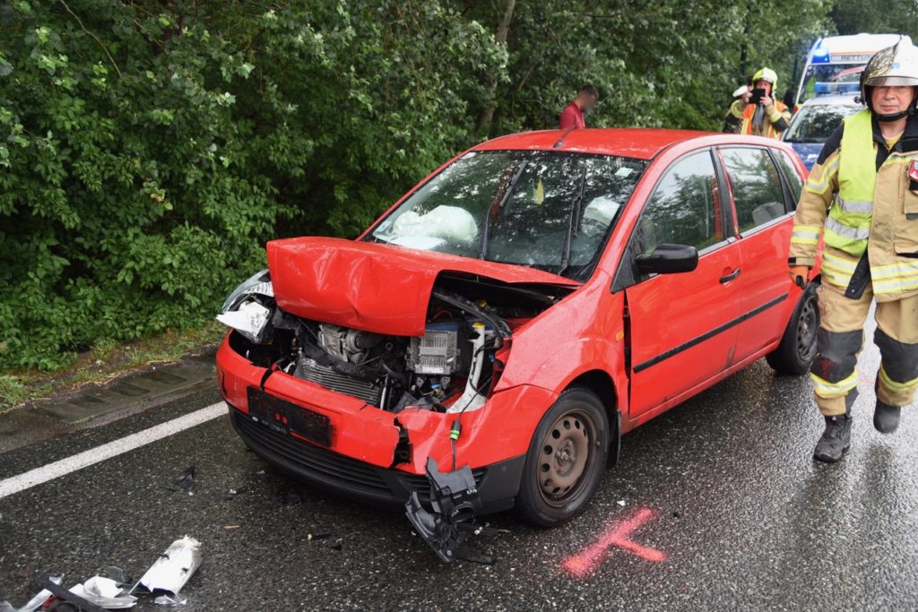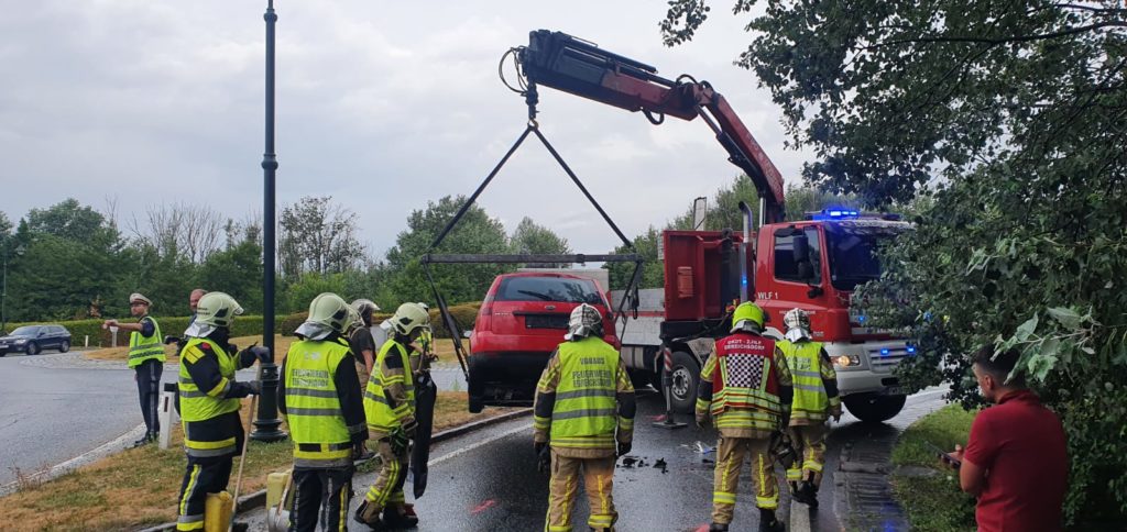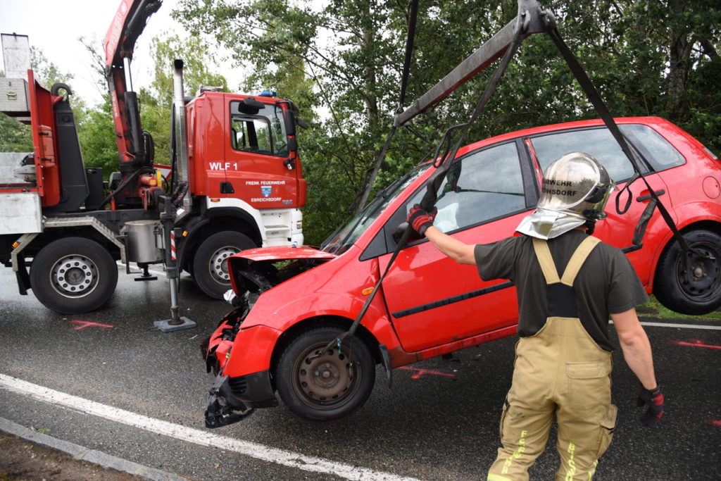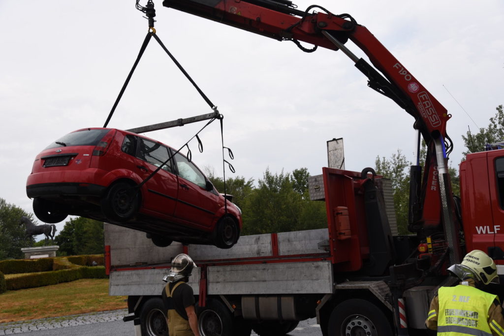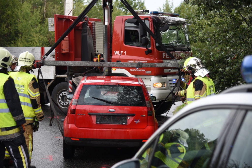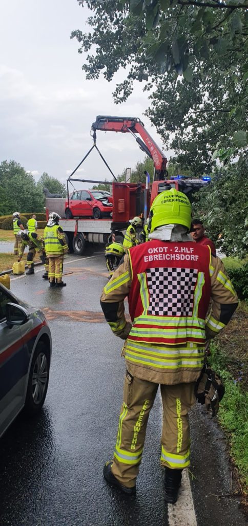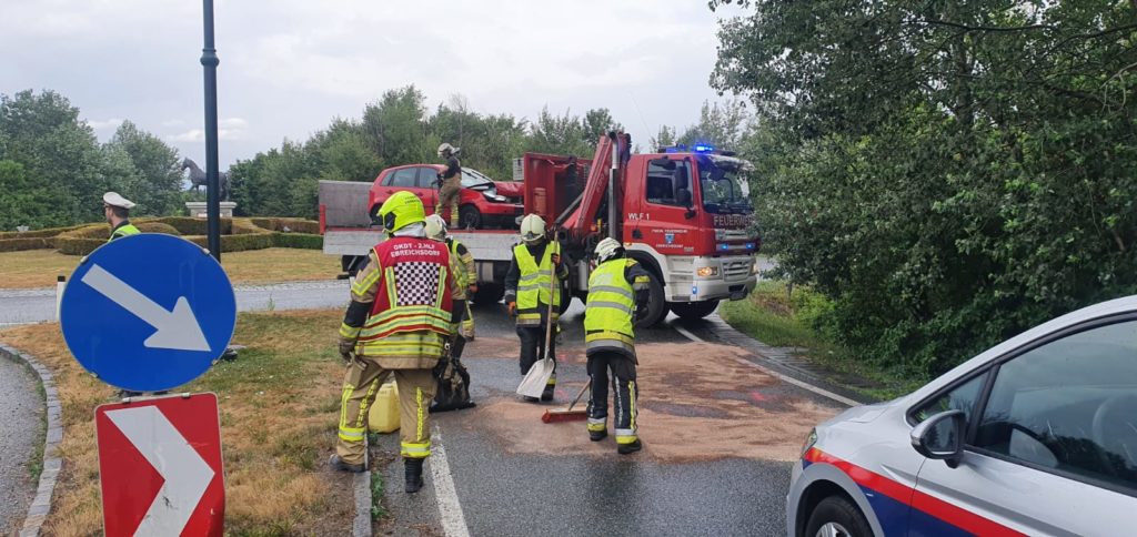 Heute um kurz vor 7 Uhr kam es auf der B16 vor dem Magna Kreisverkehr zu einem Auffahrunfall. Ein Pkw-Lenker musste sein Fahrzeug vor dem Kreisverkehr anhalten, worauf eine nachkommende Fahrzeuglenkerin nicht mehr rechtzeitig bremsen konnte. Auf der nassen Fahrbahn prallte sie mit ihrem Wagen gegen das Heck des vor ihr fahrenden Pkws. Die Lenkerin wurde bei dem Unfall leicht verletzt und von Sanitätern des Samariterbundes Ebreichsdorf versorgt und ins Krankenhaus gebracht. Der zweite Fahrzeuglenker blieb bei dem Unfall unverletzt. Wir mussten den Unfallwagen der Frau mittels Wechselladerfahrzeug mit Kran bergen und auch die ausgelaufene Betriebsmittel binden. Der Verkehr wurde an der Unfallstelle vorbeigeleitet.